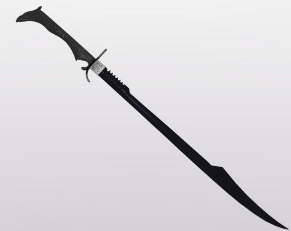 Grand cimeterre forgé dans l'acier du désert par un artisan de la tribu khazrajite de Biram. Pommeau en pierre noire gravée à la forme d'un faucon, probablement une partie de bétyle tombé du ciel, affectionné par les nomades.