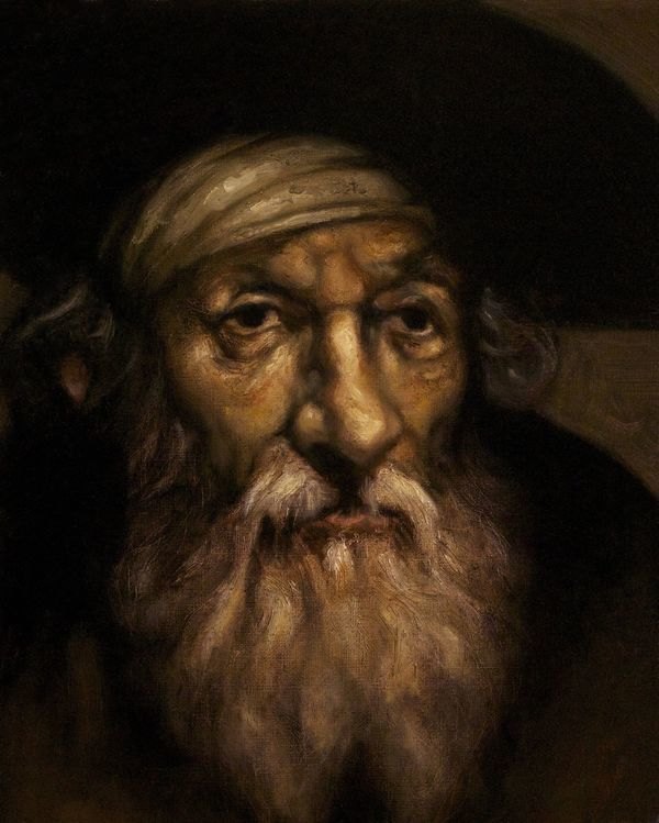 Une grande moustache blanche vient couvrir des lèvres qui ne cachent plus de dents depuis longtemps. Au milieu d'un entrelacs de profondes rides se trouvent des yeux comme deux charbons.