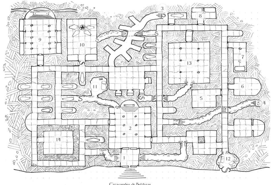 Les catacombes s'étendant sous Belthaar sont sombres, froides, humides. L'odeur de pourriture recouvre celle d'urine de rats. Les explorateurs ont pensé à prendre une lampe à huile avec trois recharges, assez pour 18 heures de lumière. Ils s'enfoncent dans les profondeurs, suivant un boyau probablement creusé par les goules, et arrivent à un croisement ou le sol de terre et de pierres fait place à des dalles poussièreuses. Les murs sont de pierre ancienne, avec les traces noires des torches qui y ont brûlé, et parfois des marques de griffe.