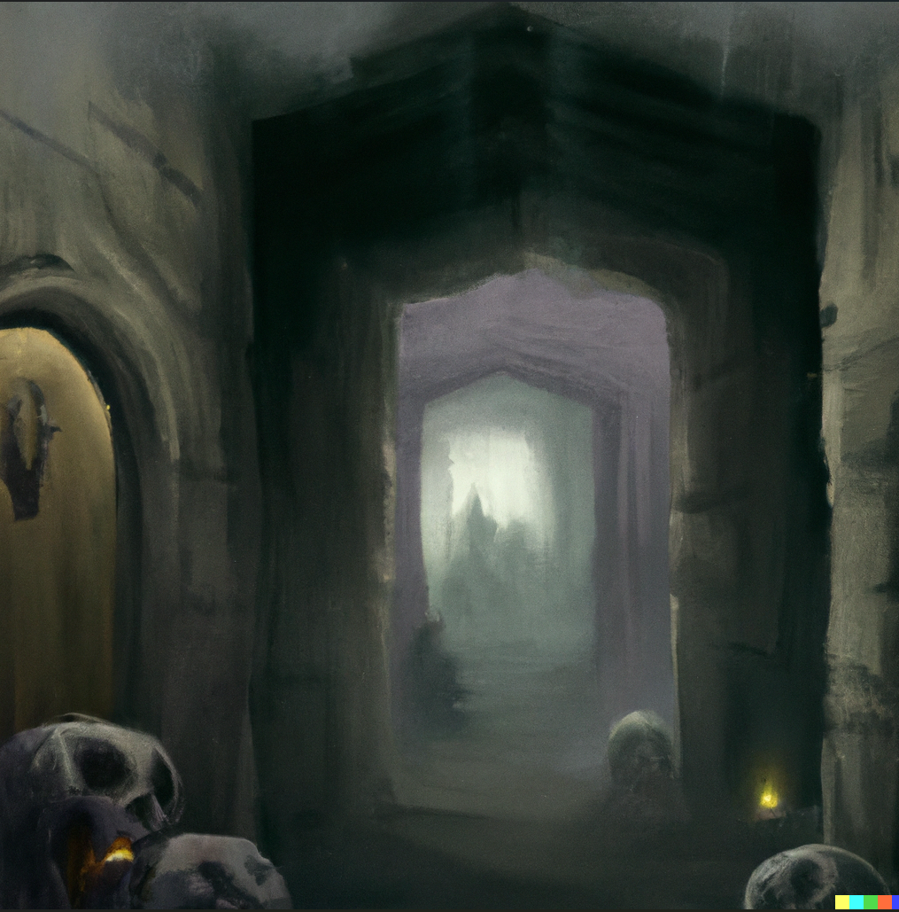 Les catacombes s'étendant sous Belthaar sont sombres, froides, humides. L'odeur de pourriture recouvre celle d'urine de rats. Les explorateurs ont pensé à prendre une lampe à huile avec trois recharges, assez pour 18 heures de lumière. Ils s'enfoncent dans les profondeurs, suivant un boyau probablement creusé par les goules, et arrivent à un croisement ou le sol de terre et de pierres fait place à des dalles poussièreuses. Les murs sont de pierre ancienne, avec les traces noires des torches qui y ont brûlé, et parfois des marques de griffe.