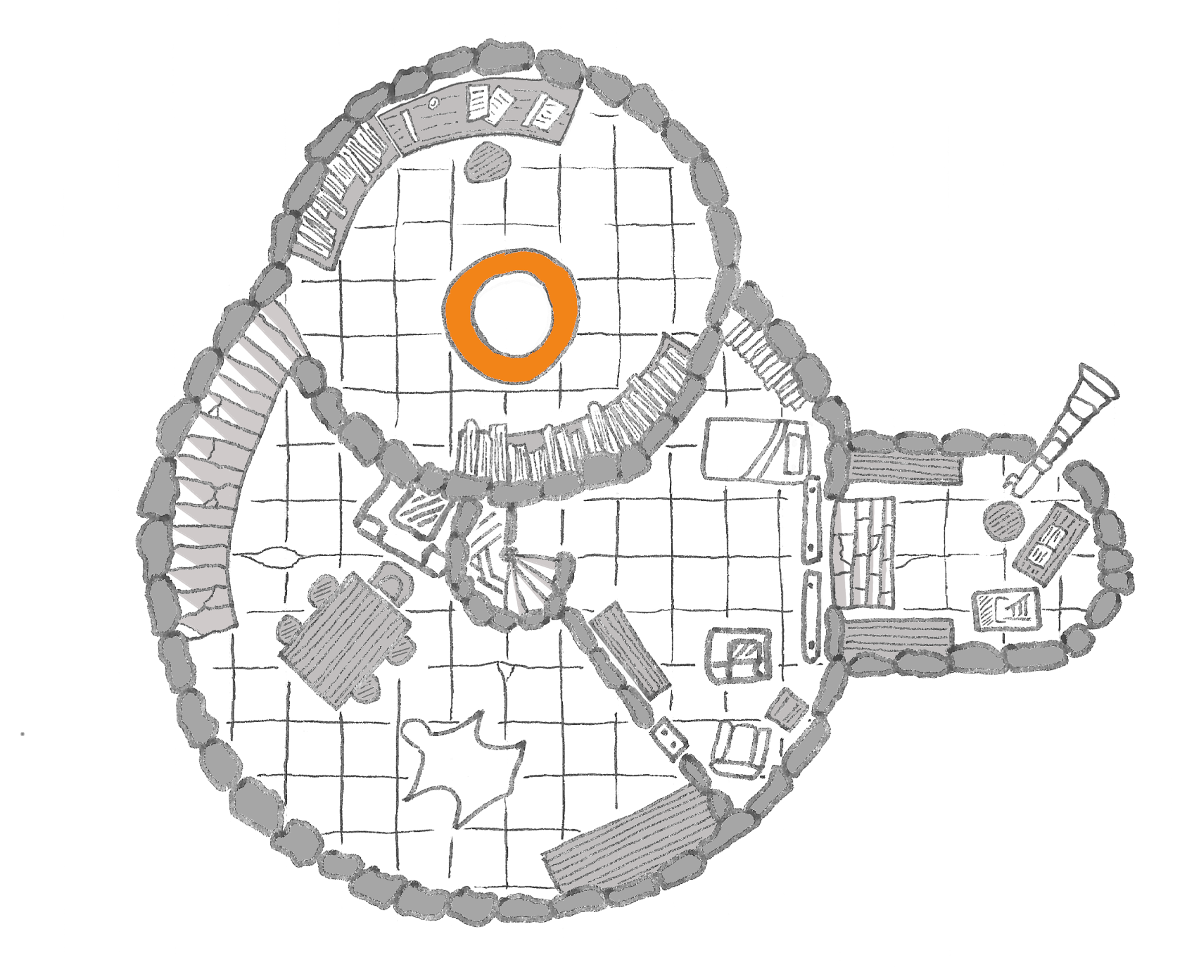 L'escalier central du niveau, fermé par une porte maintenant détruite, mène aux quartiers du sorcier. La chambre n'est pas utilisée de longue date. De la poussière recouvre ses superbes meubles, une belle collection de livres, la cheminée, le lit somptueux. Ergen trouve quelques livres rares qui iront rejoindre sa collection. Cette pièce donne, par une double porte coulissante, à l'observatoire où une longue vue en bronze est dirigée vers le ciel. Des carnets, certains très anciens, recueillent les notes et les observations de générations de sorciers du feu qui se sont succédés dans cette tour. En face de l'observatoire, une autre porte donne sur le salon. Une large table pouvant accueillir une demi-douzaine de convives est à proximité d'une belle cheminée. Seule une place, celle du maître, semble encore utilisée si l'on en croit les dépôts de poussière. Contre le mur en face monte en tournant un escalier qui conduit à la partie toute supérieure de la tour.