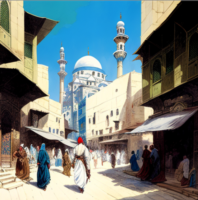 Sur le balcon, à sa gauche, se trouve Jakilo, grand, maigre, la peau grisâtre entourée d’un halo vert. A ses côtés se trouvent deux silhouettes grassouillettes, connues pour être les exécutrices du tyran. Il lève les bras et harangue la foule : le conseil secret de la révolution a voté la mort du sultan. A genoux, la tête sur un billot, Yezadig sanglote.